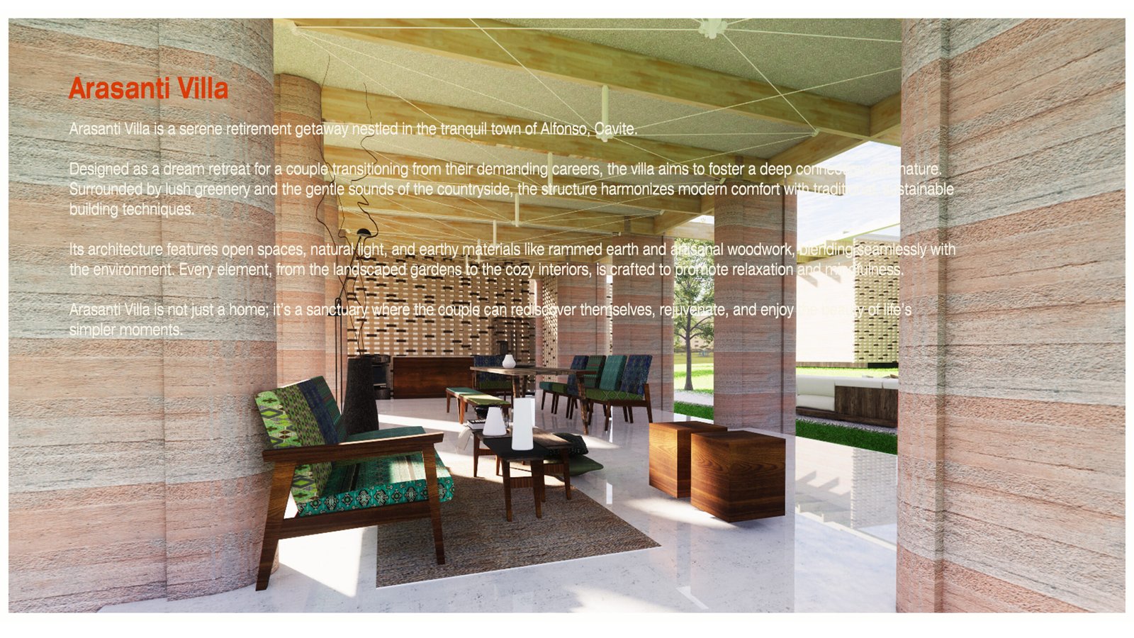 Arasanti Villa is a serene retirement getaway nestled in the tranquil town of Alfonso, Cavite. Designed as a dream retreat for a couple transitioning from their demanding careers, the villa aims to foster a deep connection with nature.